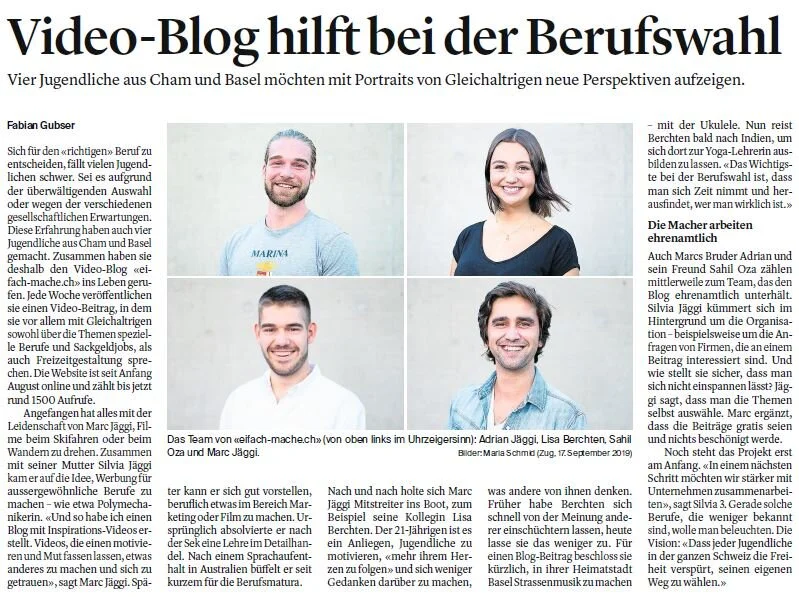 Vielen DANK "Zuger Zeitung" Ausbildungsilvia jäggi21. September 2019Jugendliche, Berufswahl, Bildung Facebook0 Twitter 0 Likes