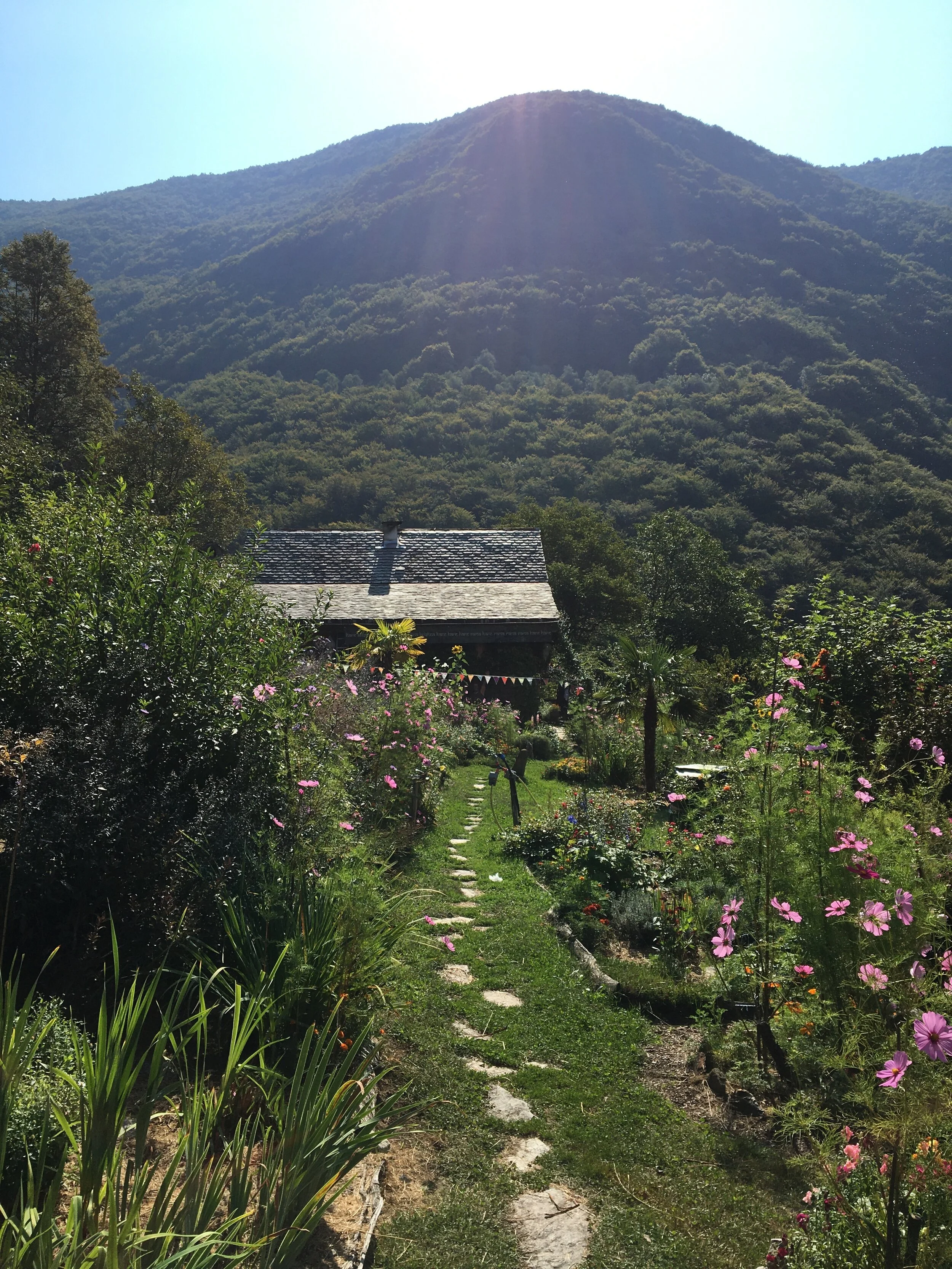 Nach einer knapp zweistündigen Wanderung kam ich am Eingangstor des Meditationszentrums an. Herzlich und mit grossem Lachen wurde ich von Krishna Chandra empfangen, welcher diesen Ashram vor knapp 15 Jahren gründete. Er lebt dort mit einer kleinen Gemeinschaft, die immer wieder gerne Pilger zum Meditieren aufnehmen. Sie verfügen über eigenen Solarstrom, Quellwasser und bewirtschaften einen grossen Garten, wo sie viele Blumen, Gemüse und Kräuter wachsen lassen. Ananda-Dham ist ein kontemplativer Ort der Besinnung und Ausrichtung inmitten der Tessiner Natur. Diesen Ort durfte ich durch eine gute Kollegin aus Bellinzona entdecken, welche des öfteren den Ashram auf Wanderungen besuchte. Die Gemeinschaft ist im “Radha-Krishna-Bhakti” vertieft. Die Verbindung zum Göttlichen steht hier für die Gemeinschaft groß im Zentrum. Es hat einen wunderschönen Tempel, in welchem jeden Tag Krishna verehrt wird.