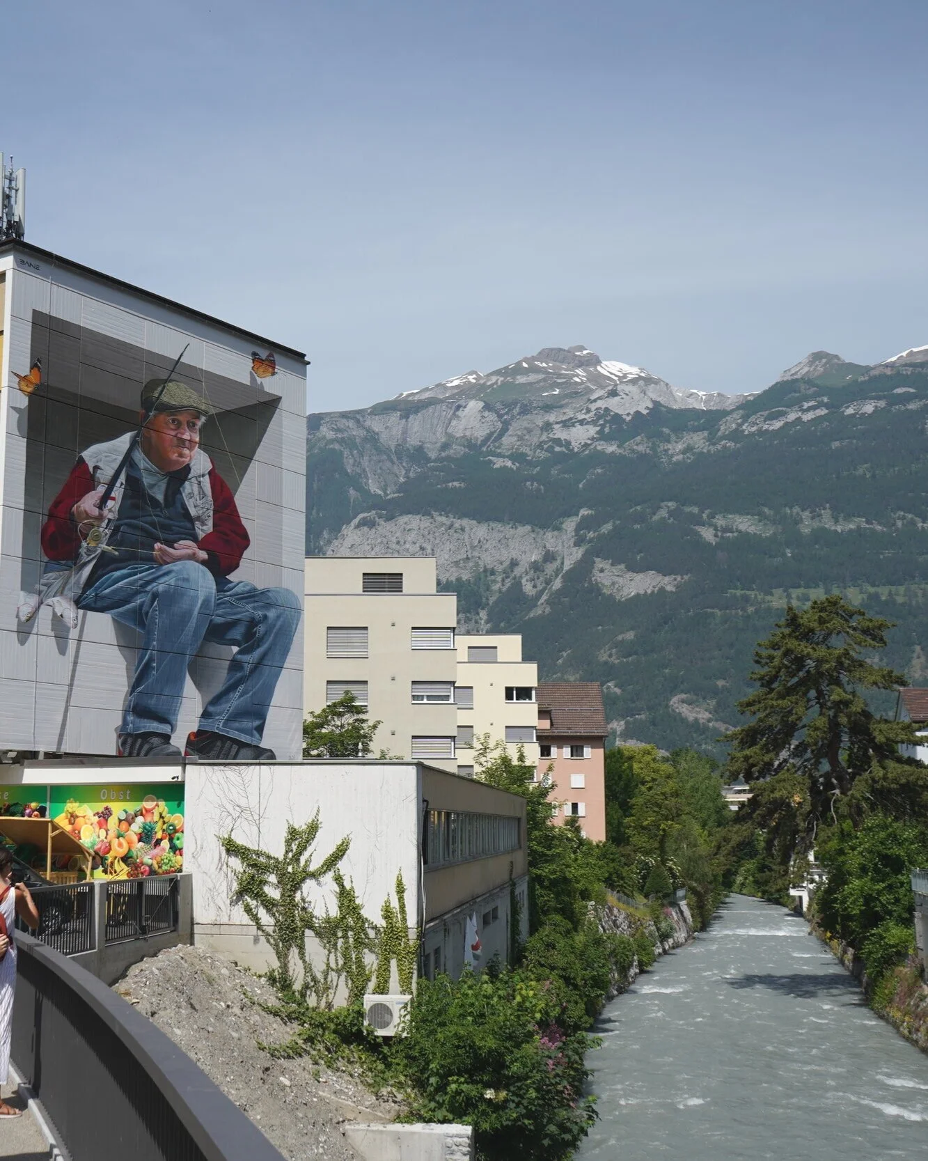 Das Graffiti Kunstwerk “Der Fischer” wurde von Fabian Bane Florin in seinem Atelier designed und dann an der Sägenstrasse 8 am Fluss in Chur umgesetzt.
